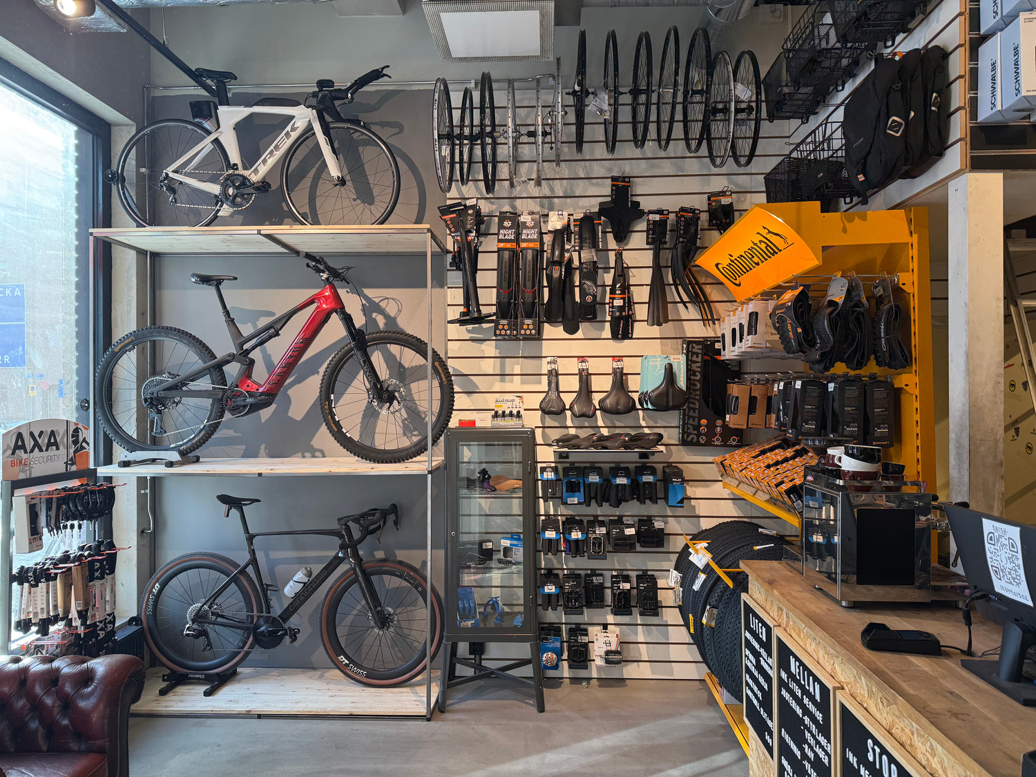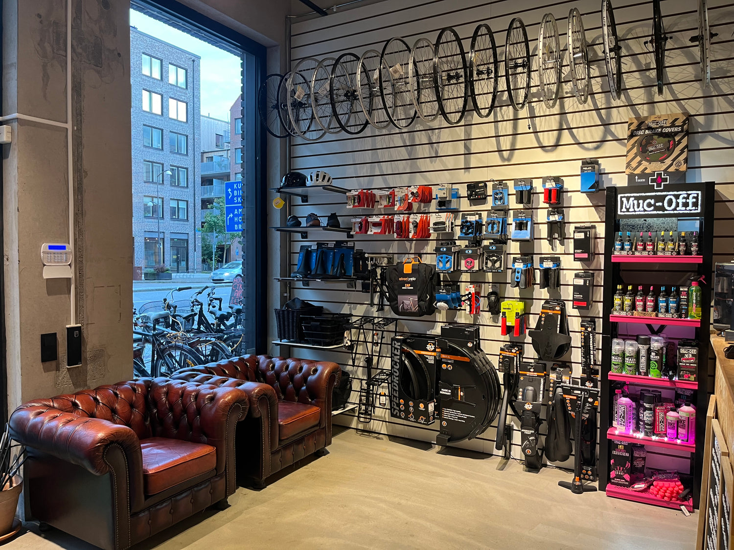 - I butiken hittar du en mängd olika tillbehör och cykelvårdsprodukter till din cykel.